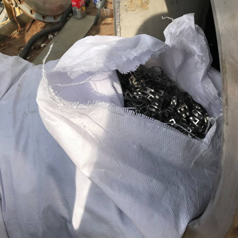 辽宁鞍山某化工厂于2018年9月跟换一批脱硫塔散堆填料,之前用的鲍尔环,脱硫效果不佳。跟我们技术人员交流后,决定跟换成不锈钢316L的扁环。